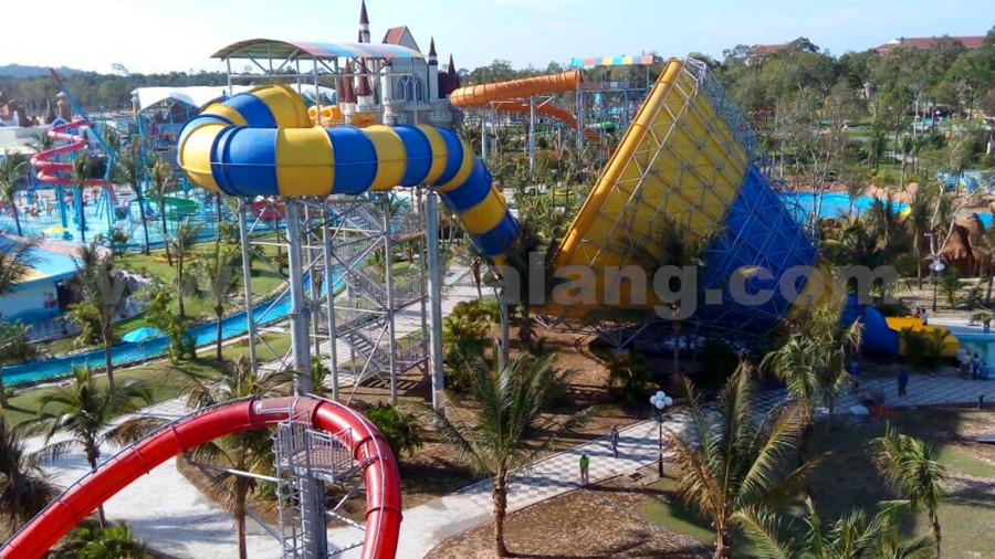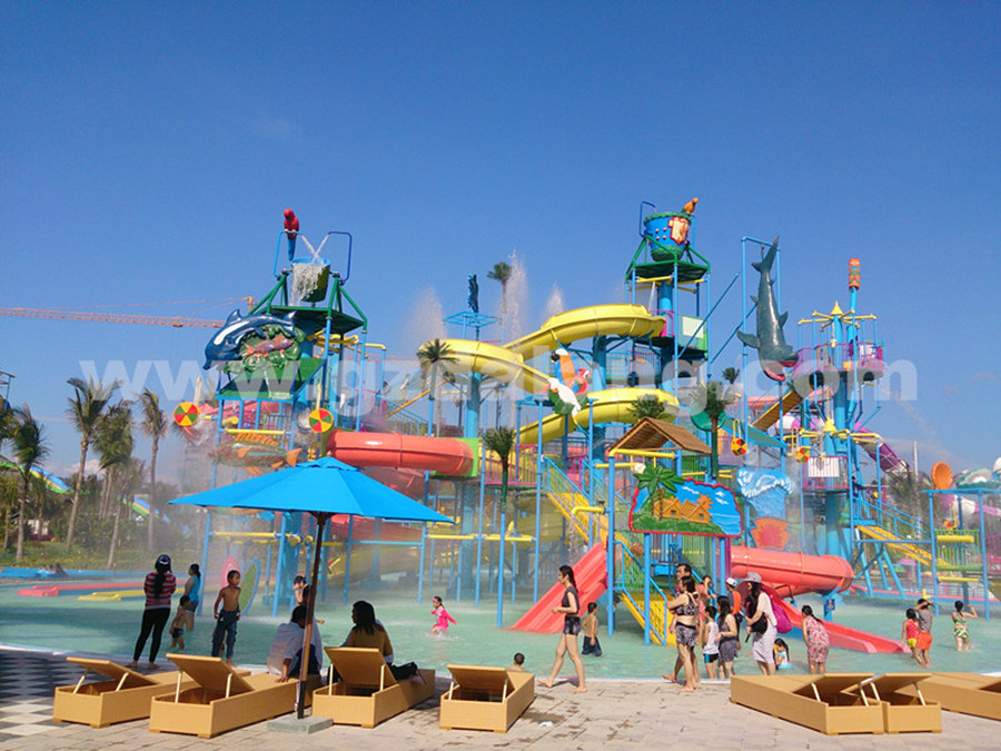 項目中有各種大型的水上樂園設備,如大喇叭滑梯,巨獸碗滑梯,合家歡滑梯以及大型夏威夷水寨,螺旋組合滑梯,海浪池,戲水設備等。該項目作為我司打入越南市場的首個大型的水上樂園項目,對廣東大浪水上樂園設備有限公司有跨時代的意義。廣東大浪水上樂園設備有限公司為富國島水上樂園項目提供了從前期的規劃設計、到施工圖紙的制作、設備的生產、工程指導安裝及調試運行等一條龍的服務。